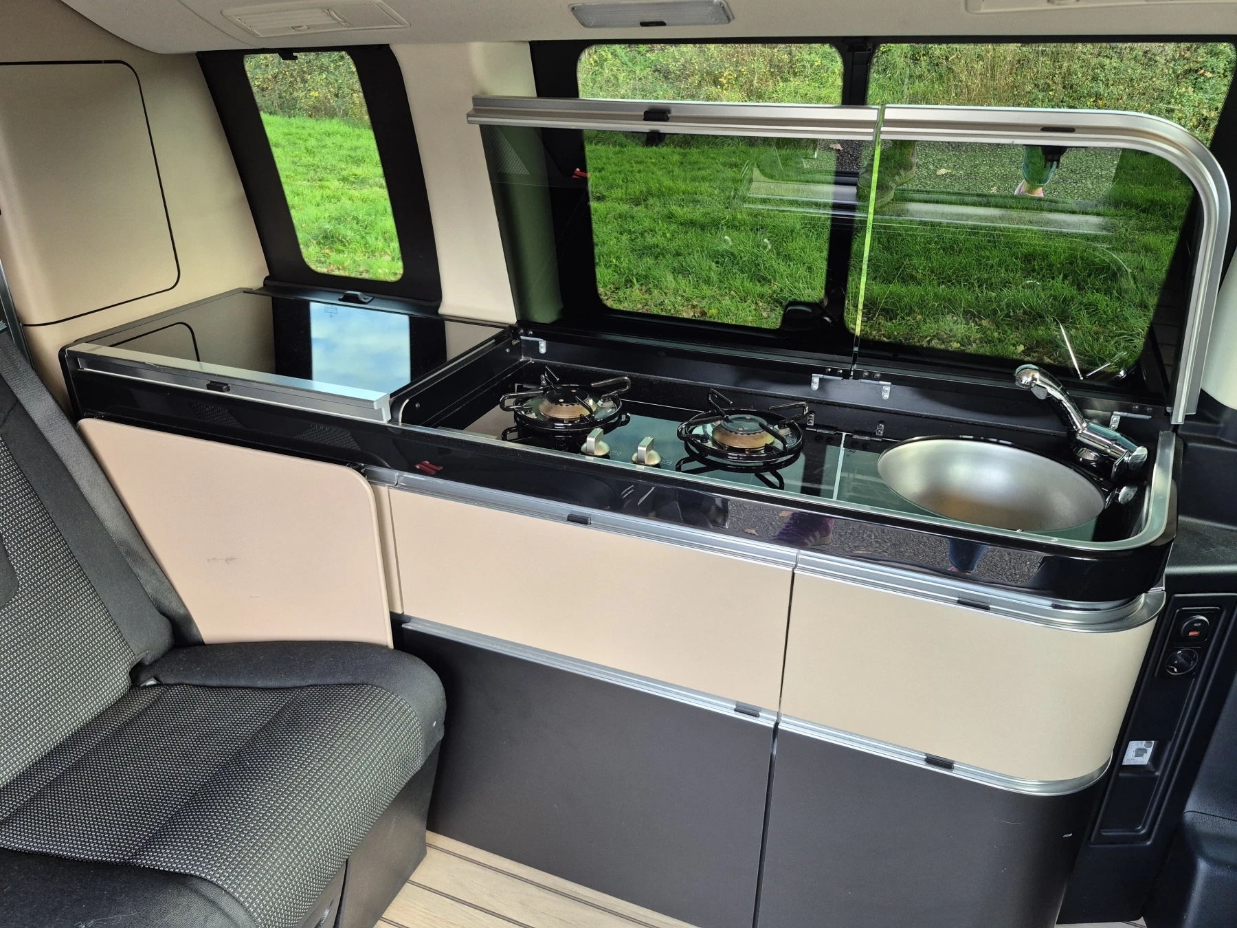 - Vitre avant droite fixe dans le panneau latéral
